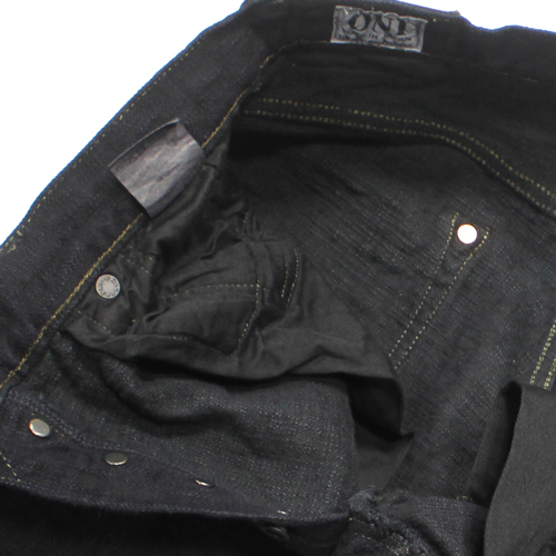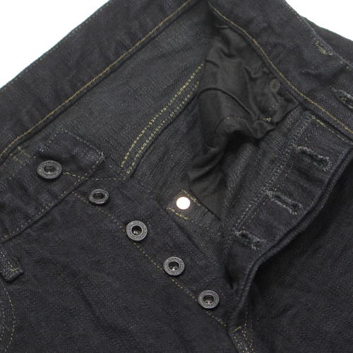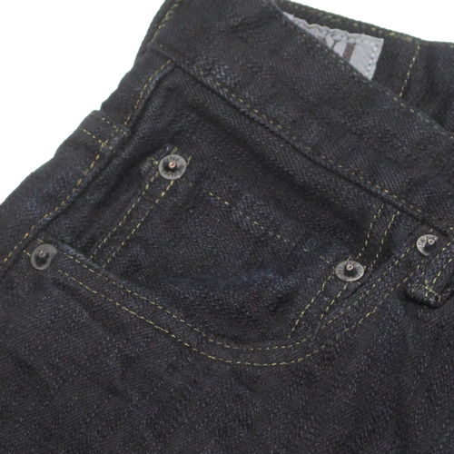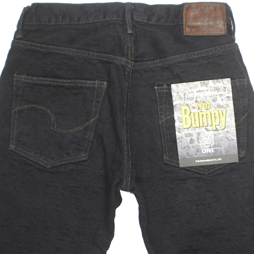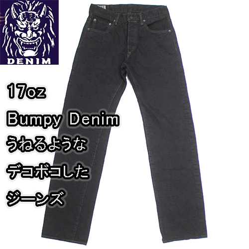 鬼デニム17ozバンピーデニムジーンズが入荷しました!シルエットはジャストトライトストレートです。鬼デニムのレギュラーストレートとリラックスストレートの間くらいのシルエットになります。直訳しますと「丁度良いストレート」という意味になります。デニムは生機(キバタ)で織られたジーンズを高温で製品染め(黒色)をしています。セルビッジや革パッチ、内側のサイズ標記タグなど少し黒に染まっています。ブラックジーンズに近い特濃紺色のジーンズに見えます。鬼デニムらしいザラつきがあり、うねるような凹凸のある生地(BUMPY)に仕上がっています。17ozの厚手のデニムですが、シークレットデニムのように柔らかいジーンズとなっています。