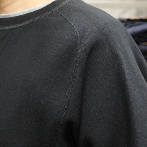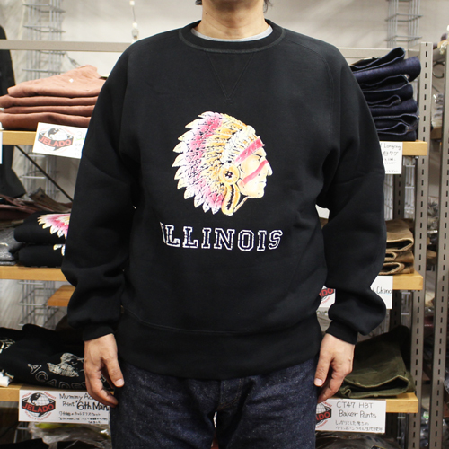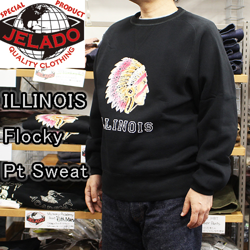JELADO(ジェラード)ILLINOIS Flocky Pt Sweatのご紹介です。が入荷しました!カラーはブラックです。JELADOが集めたヴィンテージのカラーフロッキーを元に、熟練の職人技で仕上げた電着プリントを施したスエットになります。熟練した職人が一枚ずつ手作業で行っています。量産型の機械ではないため通常の何倍もの時間と手間がかかりますが、その結果、高品質な仕上がりを実現しています。また、ボディは旧式の編み機であるアズマ編み機を使用して丸胴で編み立てられています。この編み機は70年代ごろの希少な編み機であり、吊り編み機から革新編み機へと変化していった時期のものです。そのため、表面に凹凸感があり、ふっくらとした風合いが楽しめます。袖付けはフリーダムスリーブとなっています。