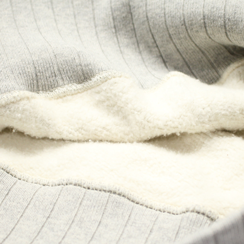 貴重な吊り編み機でゆっくりと時間を掛けて編み上げられた生地は、天井から吊られた機械と糸によって、糸と生地そのものの重さを利用し、生地に余分なテンションをかけず、ゆっくりと時間をかけることで空気も一緒に編みこんだような、程よいムラ感のある独特の風合の生地に仕上がるのが特徴です。