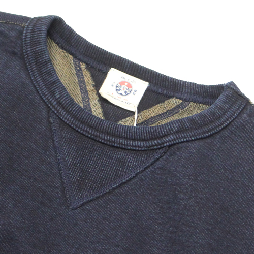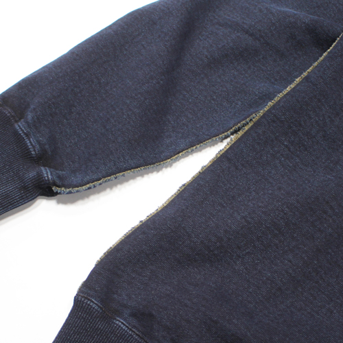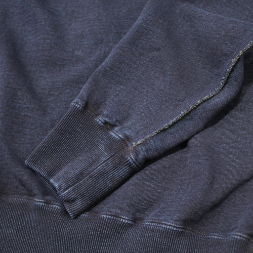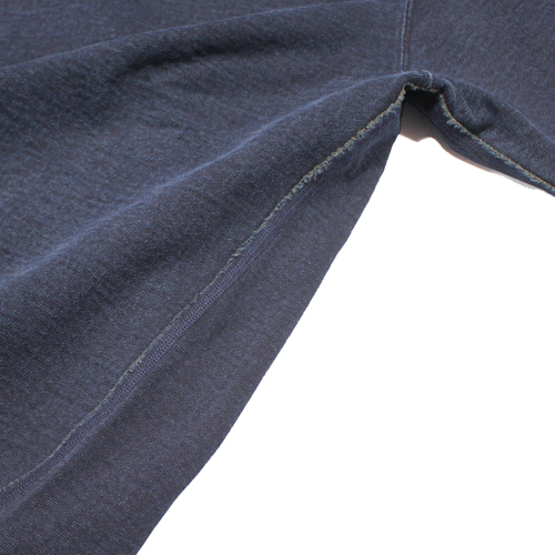 インディゴロープ染色を施し、度詰めでしっかりと編み上げた裏毛生地を使用。空紡糸ならではのドライな質感が心地良く、着込むほどにロープ染色特有の美しいアタリが現れる楽しみがあります。
