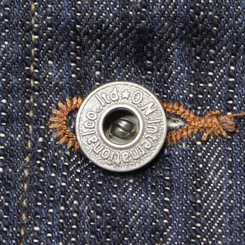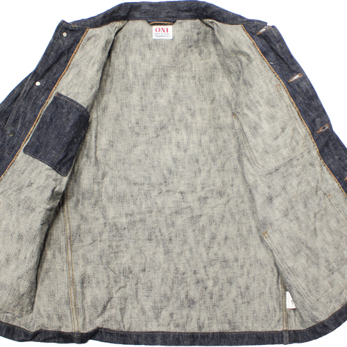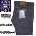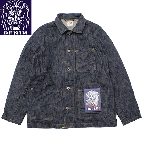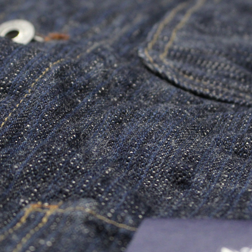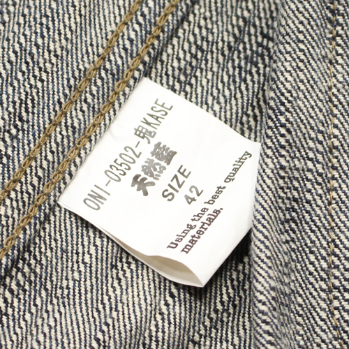 鬼デニム鬼KASEデニムカバーオールが入荷しました!ロープ染色では表現できない濃淡のある染めに成功した天然藍によるロープ染色のデニムになります。濃淡のある染めは、正藍枷(かせ)染めでしか得られない枷ムラの表情をロープ染色で表現したデニムと言うところが最大の特徴です。 近くで見ますと、濃淡のある糸ですので、ストライプ調にムラが見えます。デニムの凹凸もいつもの鬼デニムより更にザラ付きがあります。更にセルビッチは歌舞伎耳(16オンス)となっています。