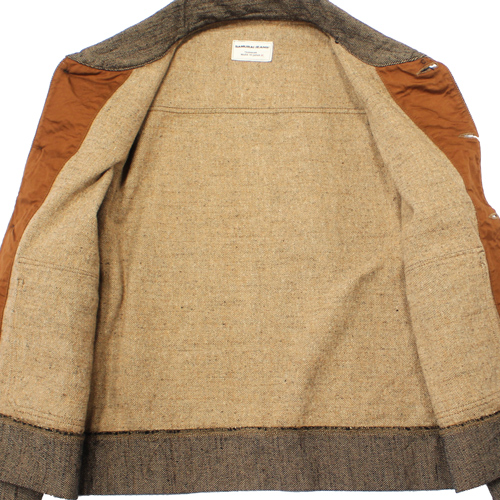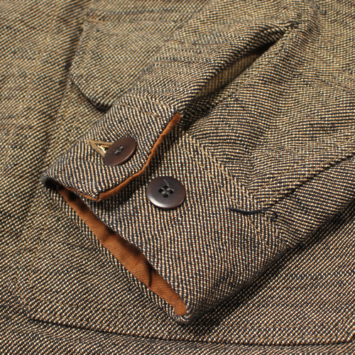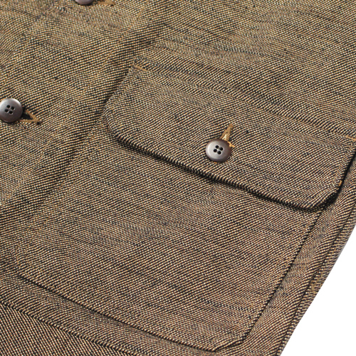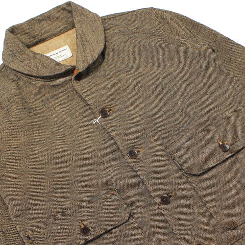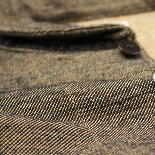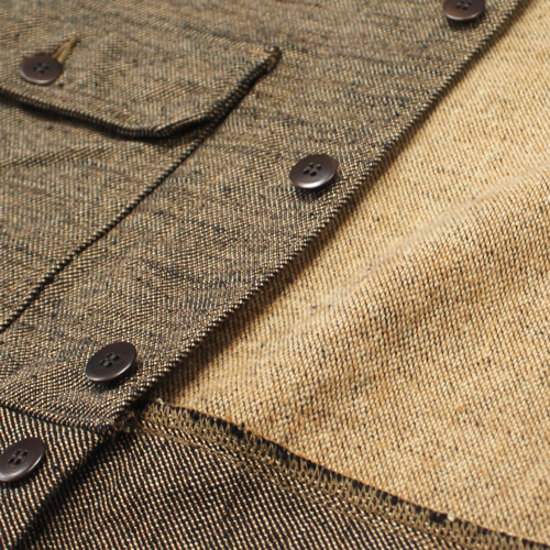 経糸・緯糸には、ヘビーオンスデニムにも使われるほどの非常に太い糸を採用。経糸は双糸にすることで強度を高め、緯糸にはスラブ糸を組み合わせることで、生地にほど良いザラ感と立体感を持たせています。さらに、コットン素材でありながらウールサージのような表情に近づけるため、織りあがった生地には軽く起毛加工を施しています。素材の魅力とサムライジーンズらしい無骨な雰囲気が詰まった、存在感のあるフランネルジャケットです。