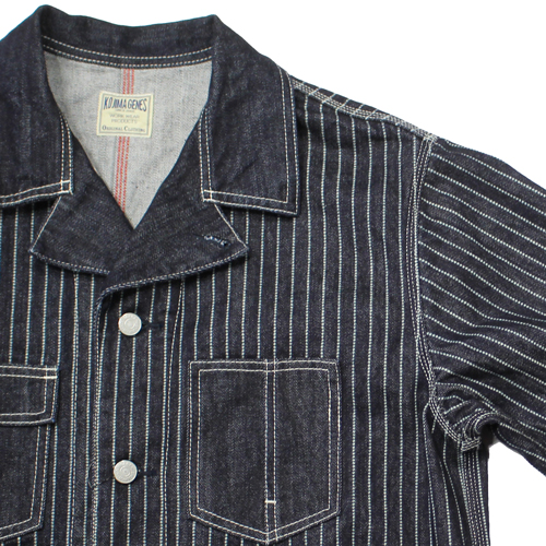 襟元はオープンカラーのようにすっきりと開くデザインで、カジュアルながらもスタイリッシュな印象。さらに襟やポケット部分をデニム生地で切り替えることで、児島ジーンズならではの個性と遊び心がプラスされています。
