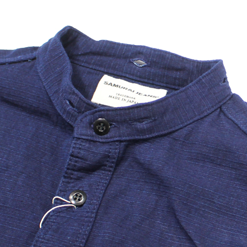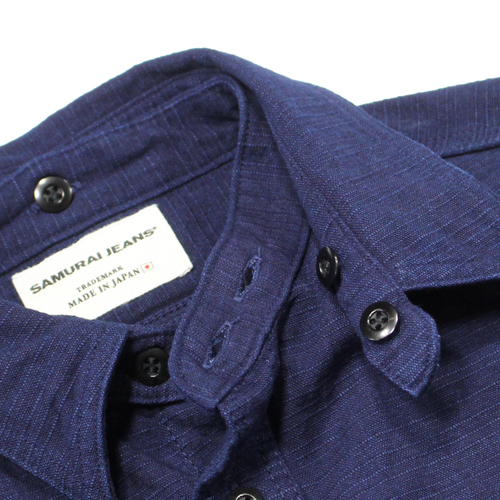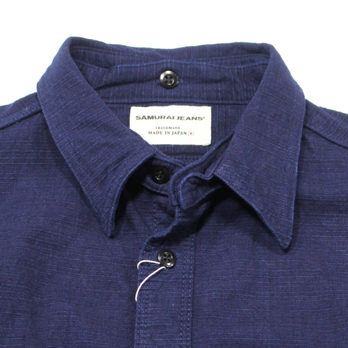 サムライジーンズ襟脱着切り替えシャツが入荷しました!藍×インディゴ染料を配合した糸を使用し、2種類の変わり織り生地を組み合わせた、表情豊かなカジュアルシャツです。身頃やポケットには、緯糸にスラブ糸をランダムに織り込んだ藍染めの“葦(アシ)柄”生地。袖には太い畝(ウネ)が特徴の藍染め格子生地を使用し、さりげないコントラストを楽しめるデザインに仕上がっています。