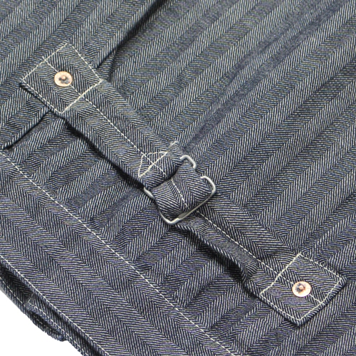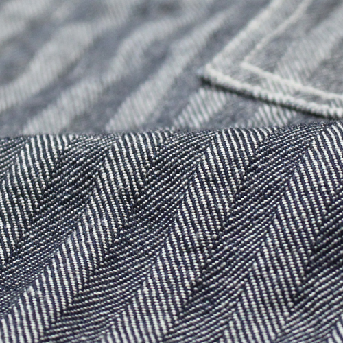 生地には、独特の織り柄が魅力のヘリンボーン素材を採用。一般的なデニムとはひと味違う表情と奥行きのある風合いが楽しめます。力織機でじっくりと織り上げられた生地は、しっかりとした厚みとハリを持ちながらも、着用を重ねるごとに柔らかさが増し、自然な経年変化を感じていただけます。