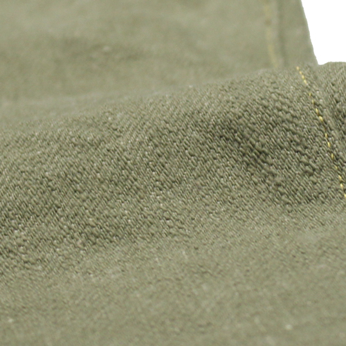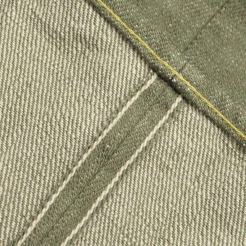 経糸(タテ糸)には珍しいオリーブカラー、緯糸(ヨコ糸)には生成り色(ナチュラル)を使用した18ozデニムを採用。オリーブを経糸に用いることで、全体として落ち着きがありながらも個性を感じさせる独特の色合いに仕上がっています。