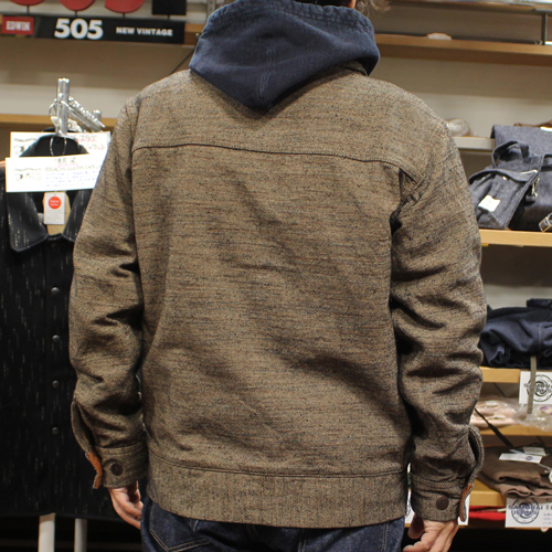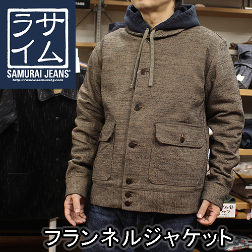 サムライジーンズの無地フランネルジャケットのご紹介です。カラーはブラックですが、ベージュ系×ブラックで織られているため、実際にはブラウン寄りの落ち着いた色味に見えるのが特徴です。フライトジャケット「A-1」スタイルをベースにしたデザインで、武骨さの中に上品さも感じられる仕上がりとなっています。