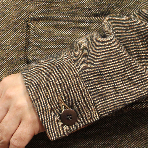 経糸・緯糸には、ヘビーオンスデニムにも使われるほどの非常に太い糸を採用。経糸は双糸にして強度を高め、緯糸にはスラブ糸を組み合わせることで、生地にほどよいザラ感と立体的な表情を持たせています。また、コットン素材でありながらウールサージのような雰囲気に近づけるため、織り上がり後には軽い起毛加工を施しています。
