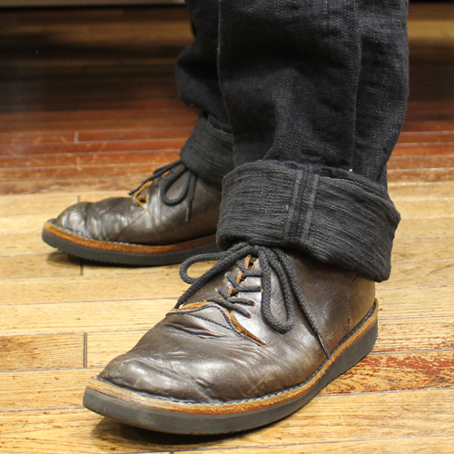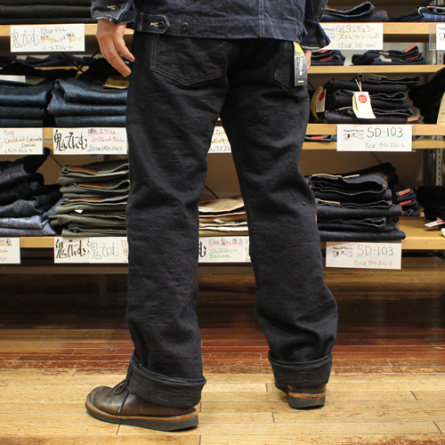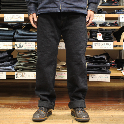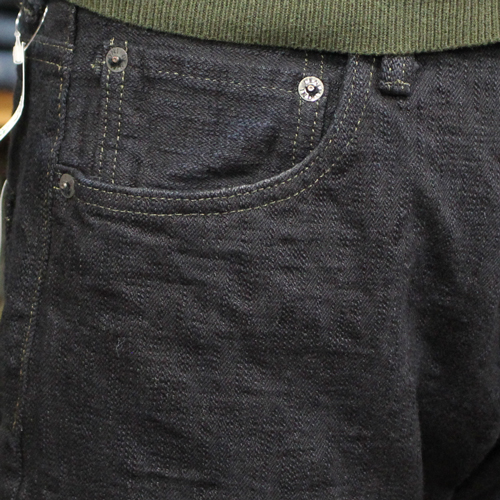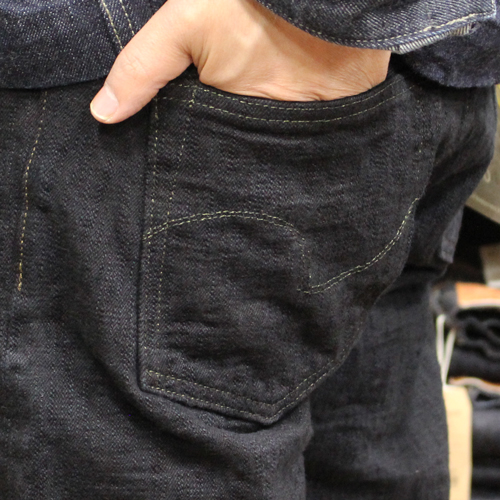 鬼デニム17ozバンピーデニムジーンズのご紹介です。シルエットはジャストトライトストレートです。鬼デニムのレギュラーストレートとリラックスストレートの間くらいのシルエットになります。直訳しますと「丁度良いストレート」という意味になります。デニムは生機(キバタ)で織られたジーンズを高温で製品染め(黒色)をしています。セルビッジや革パッチ、内側のサイズ標記タグなど少し黒に染まっています。ブラックジーンズに近い特濃紺色のジーンズに見えます。鬼デニムらしいザラつきがあり、うねるような凹凸のある生地(BUMPY)に仕上がっています。17ozの厚手のデニムですが、シークレットデニムのように柔らかいジーンズとなっています。