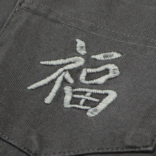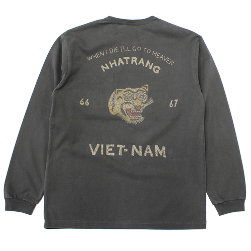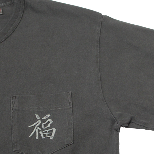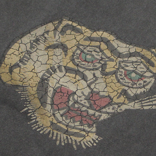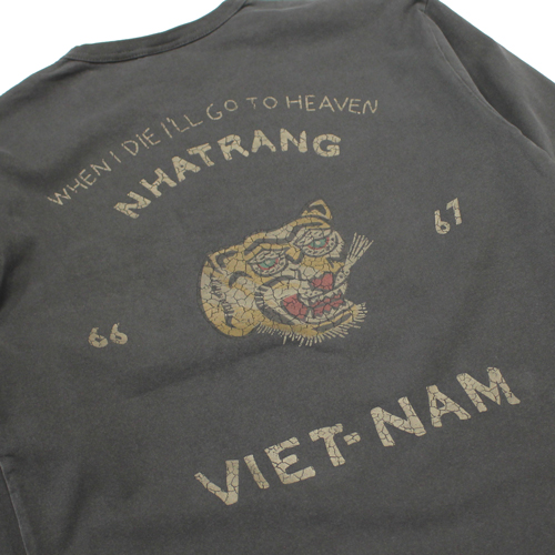 左胸のポケットは刺繍仕様で、さりげないアクセントに。背中には、クラック(ひび割れ)風にデザインされたベトジャン柄のプリントを採用しています。プリント後にピグメント加工を施すことで、全体にフェード感が生まれ、よりヴィンテージライクな表情に仕上がっています。