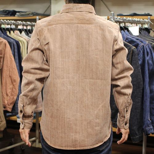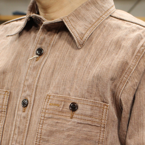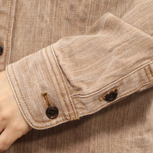 経糸に天然の柿渋染め糸を使用した、13.0ozデニムのワークシャツとなっています。柿渋染めは「天日染め」とも呼ばれ、太陽の光や空気に触れて酸化することで、時間の経過とともに色味が深まり、独特の表情へと変化していくのが特徴です。柿渋染めの経糸は1本1本微妙に色合いが異なるため、生地全体に奥行きのある豊かな表情が生まれています。