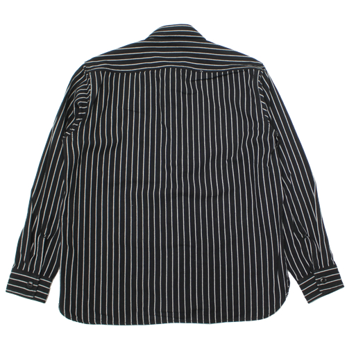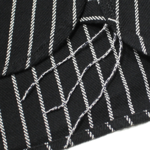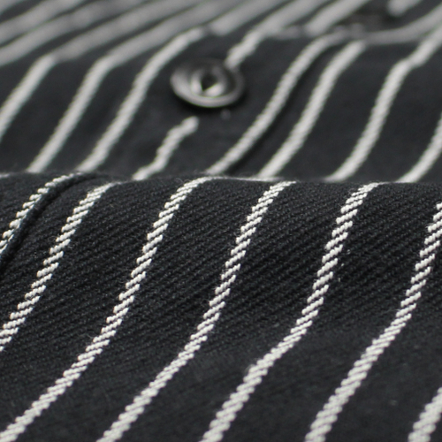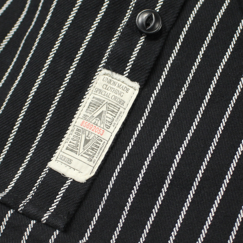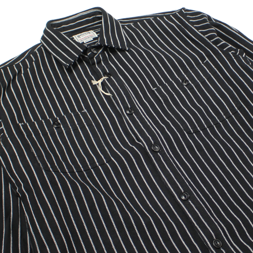 縫製は強度の高いトリプルステッチ仕様で、ポケットや襟元など細部まで丁寧なつくり。さらにユニオンチケットなど、ヴィンテージライクなディテールが随所に盛り込まれており、古き良きワークシャツの雰囲気をしっかりと感じられます。ブラックベースのストライプ柄は主張しすぎず、コーディネートに取り入れやすいのもポイントです。