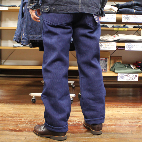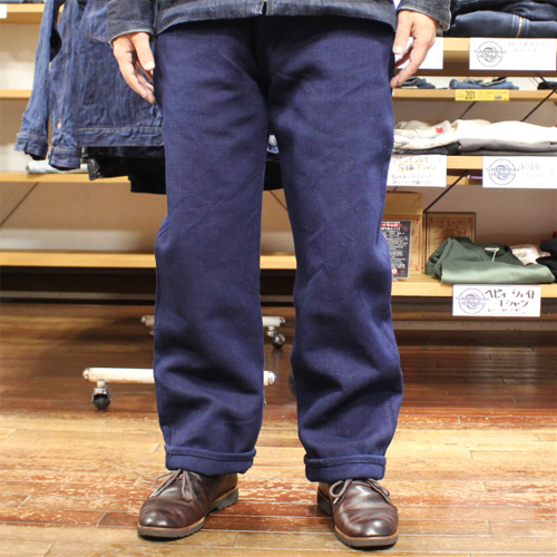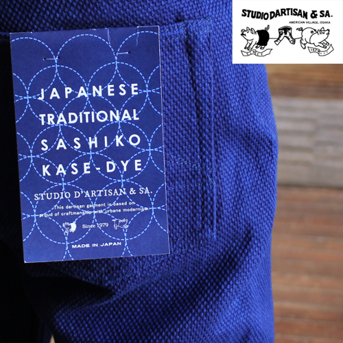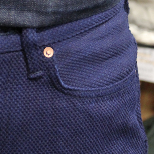 生地表面には、縦糸・横糸ともにカセ染めによる最濃度のインディゴ糸を採用。奥行きのある深いインディゴカラーが特徴で、着用を重ねることで刺し子特有の凹凸感とともに、美しい経年変化を楽しめます。