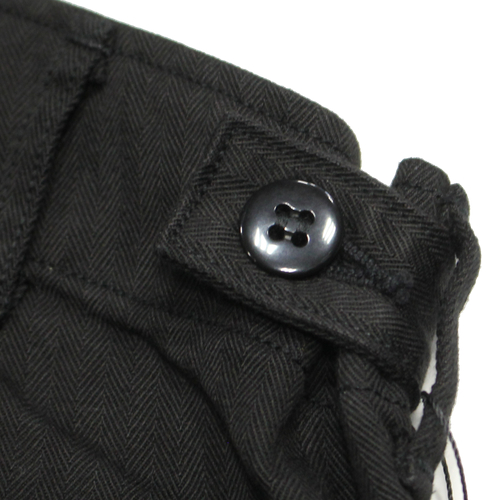 当時のヴィンテージヘリンボーンは、撚りに変化を付けることで畝(うね)をくっきりとさせた丈夫な生地となっています。JELADO社が所有するヴィンテージをもとに染色をスレンで行い、穿きこむごとに色が落ち、ヴィンテージのような経年変化が楽しめます。ウエストには調整ベルトが付いていますので、オーバーサイズで穿かれる方に便利な機能となっています。