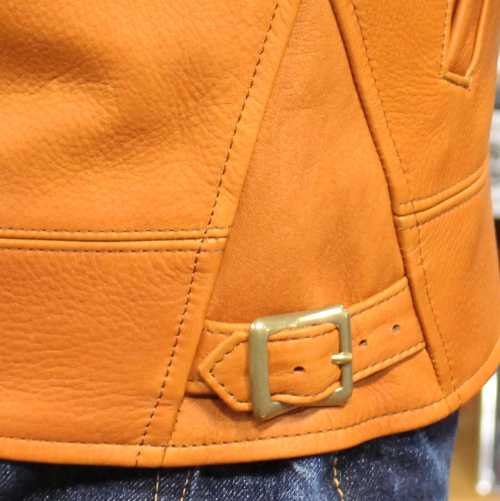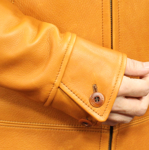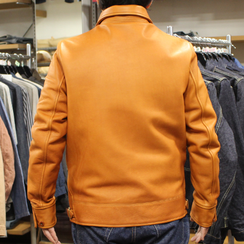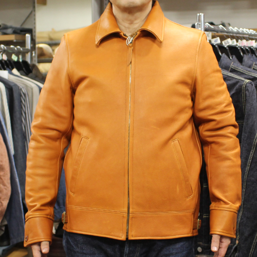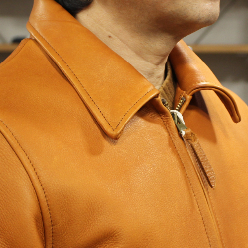 オルゲイユSteerOilコサックジャケットのご紹介です。カラーはキャメルです。1920 年代のコサックスタイルをデザインの基調としたジャケットです。水と染料を用いて仕上げられたステアオイルレザーは、通常の牛革を超える柔らかさと、オイル加工特有のしっとりとした手触りが魅力です。ミリタリー調のディテールに加え、装飾されたナットボタンやサイドアジャスター仕様など、オルゲイユならではのクラシックな雰囲気を融合させたデザインが特徴の一着です。