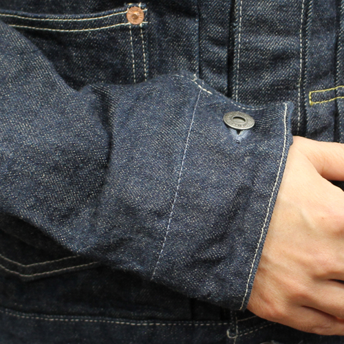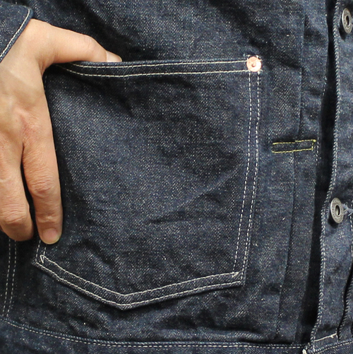 1953年に「石川台」と言う名称の日本製リング精紡機が製造されました。これより古い機械は製造元にも記録が無く現在、稼働している精紡機としては日本で最古のものだと言われています。「石川台」は最新のリング精紡機と比較しスピードが1/3程度でゆっくりした速度で紡績します。その為、生産性は優れませんが綿へのストレスが少ないため綿本来の自然な表情は、まるで手紡ぎのような表情(ムラ)になります。これは「石川台」ならではの特徴です。この製品のデニム生地は、「石川台」で6番手のストレートヤーンを紡績した糸を使用して1950年製のシャトル織機で製造致しました。経糸のインディゴはシークレットデニムと同色に染色していますので正に1950年代に作られたデニム生地のように仕上がっています。ローテンション織で糸がソフトなので手触り感、オールドデニムのような色合いとなっています。ヘリテージファッションがお好きな方にもお勧めのジャケットに仕上がっています。