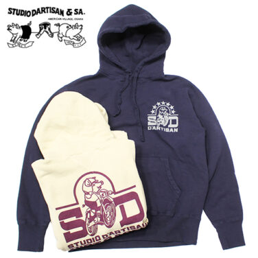 ステュディオダルチザンプリントパーカーのご紹介です。!カラーは、ネイビーとアイボリーです。フロントにはブタさんがバイクに乗っているシーンがデザインされています!生地は、和歌山県の工場でシンカー機を使って編み立てたオリジナルの裏起毛スウェット。縫製も和歌山、染め・プリントは岡山と、完全メイドインジャパンにこだわって仕上げた品質の高いアイテムです。暖かい裏起毛素材に、両Vガゼットなどヴィンテージ仕様のディテールも加わり、ダルチザンらしい雰囲気がしっかりと楽しめます。デザイン性とクラフト感の両方を味わえる、存在感のあるスウェットパーカーです。