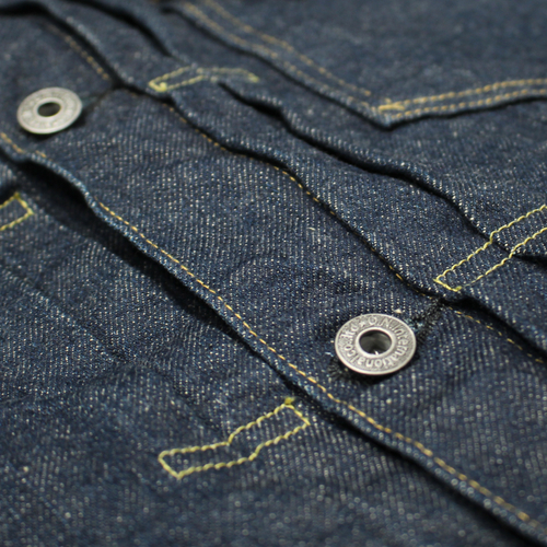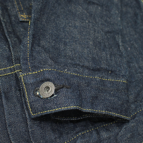 この製品のデニム生地は、「石川台」で6番手のストレートヤーンを紡績した糸を使用して1950年製のシャトル織機で製造致しました。