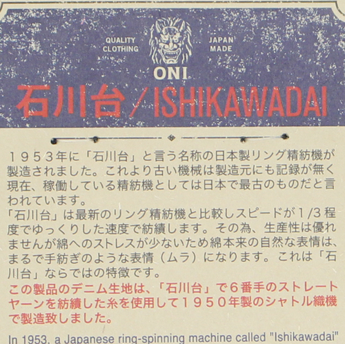 この製品のデニム生地は、「石川台」で6番手のストレートヤーンを紡績した糸を使用して1950年製のシャトル織機で製造致しました。