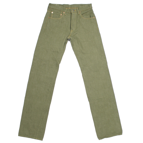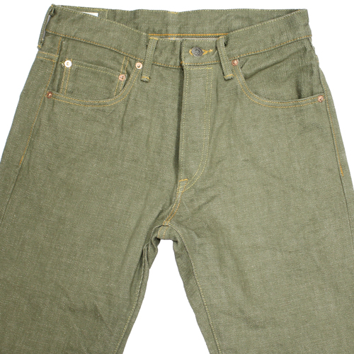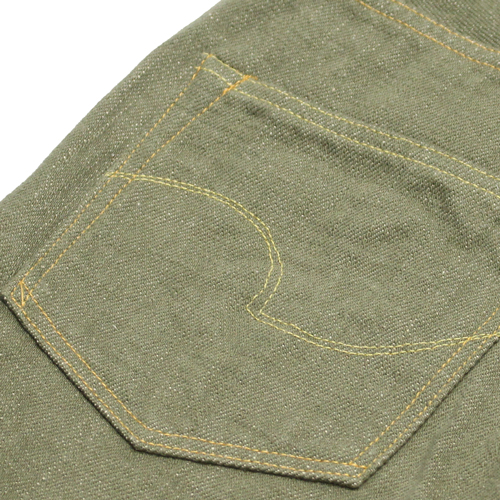 経糸(タテ糸)には珍しいオリーブカラー、緯糸(ヨコ糸)には生成り色(ナチュラル)を使用した18ozデニムを採用。