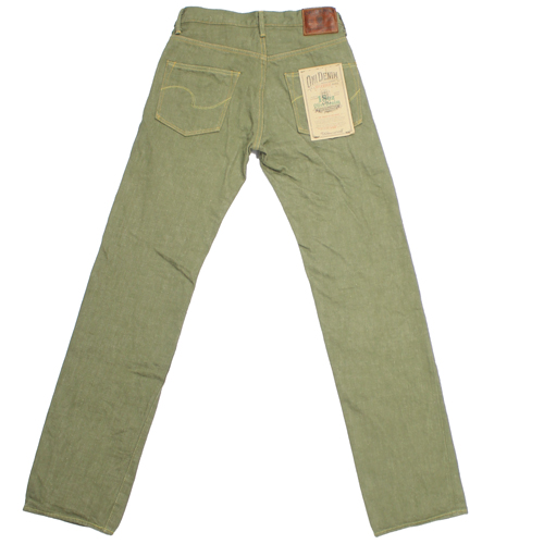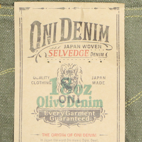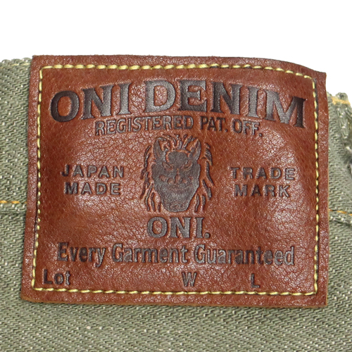 経糸(タテ糸)には珍しいオリーブカラー、緯糸(ヨコ糸)には生成り色(ナチ鬼デニム18ozオリーブデニムジーンズ。